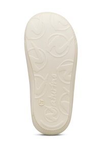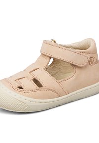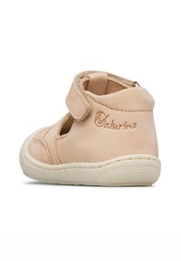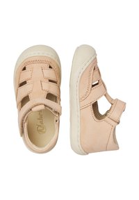 Sandale beige pour tout-petit avec bout fermé, bride en Velcro, côtés évidés et semelle en caoutchouc texturée, conçue pour le confort et une mise en place facile.