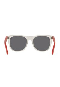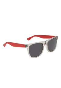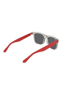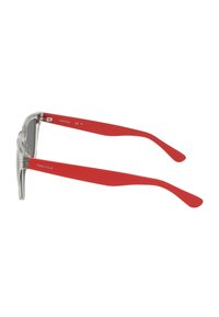 Lunettes de soleil à monture transparente avec verres noirs et branches rouges, marquées Nautica à l'avant de la monture et sur les branches.