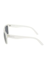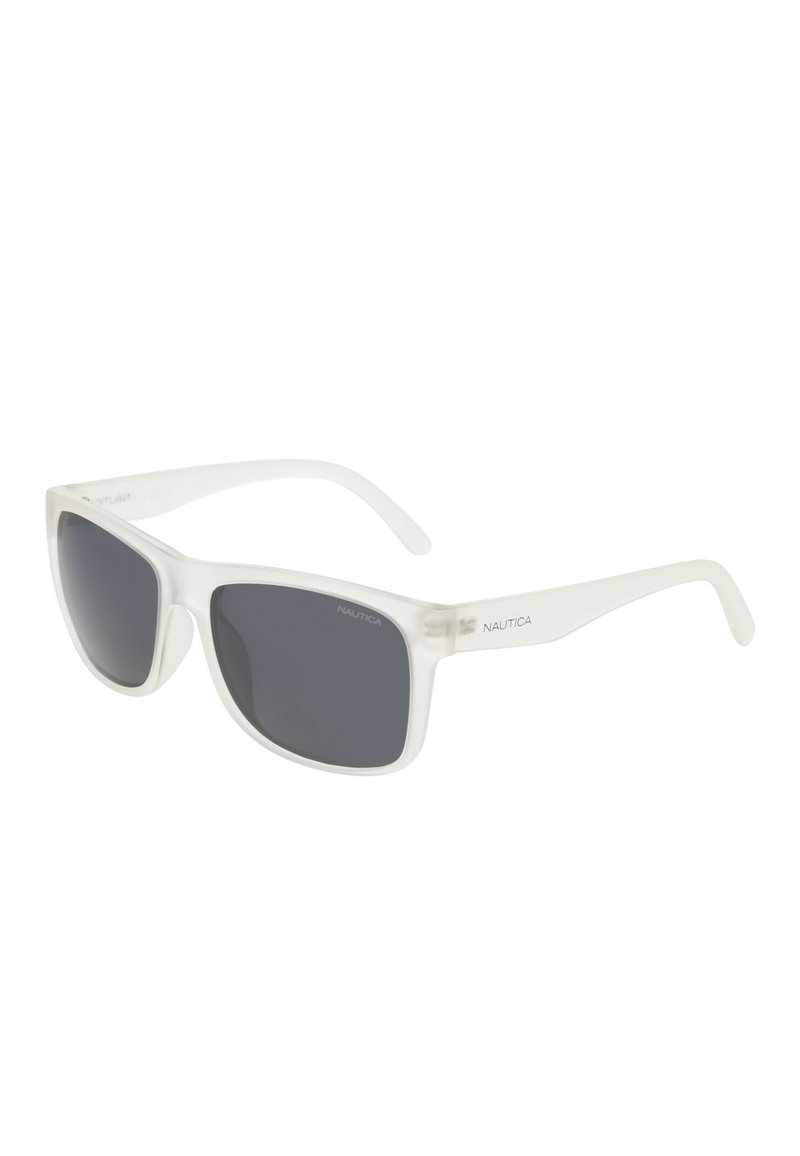 Lunettes de soleil avec monture transparente, verres rectangulaires noirs et logo "Nautica" sur la branche et le verre.