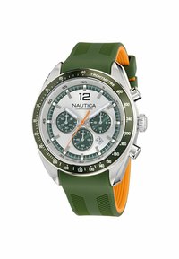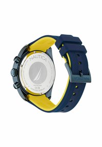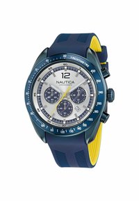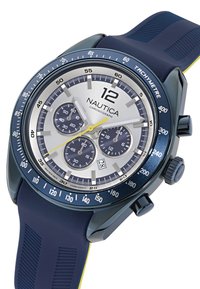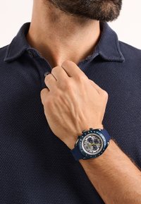 Montre avec bracelet en caoutchouc bleu, cadran argenté, trois sous-cadrans et boîtier rond. Polo bleu marine texturé en arrière-plan.