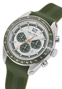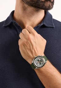 Montre chronographe en argent avec bracelet en silicone vert, cadran blanc, accents noirs et sous-cadrans. Portée sur une main sur un fond de polo bleu marine.