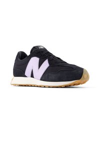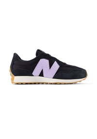 Chaussures de sport noires fabriquées à partir d'un mélange de tissu texturé et de daim. Elles comportent une semelle intercalaire blanche et une semelle extérieure en caoutchouc couleur gomme.