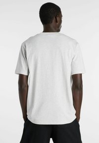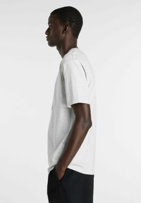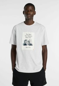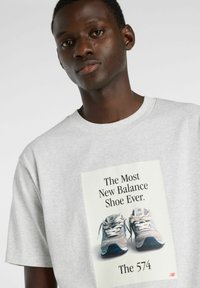 Homme portant un t-shirt gris clair avec un motif de chaussure New Balance 574 et un short noir, debout devant un fond blanc.