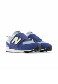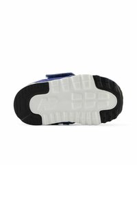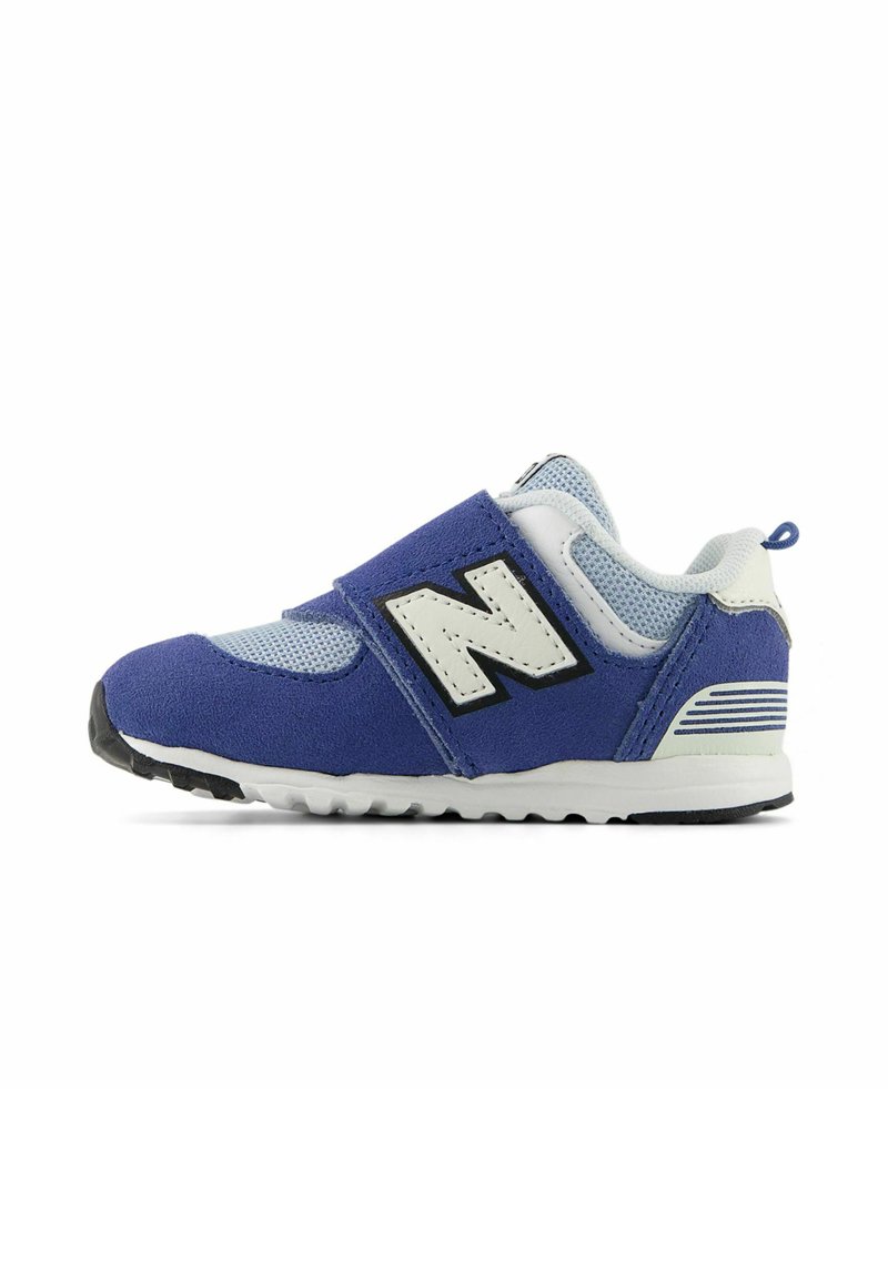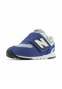 Baskets pour tout-petits bleues et blanches avec bride velcro, tissu en mesh et logo "N" noir et blanc sur le côté.