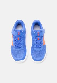Baskets athlétiques bleues et orange avec semelle blanche, lacets et bride à velcro, tige en mesh respirant, logo latéral, isolées sur fond clair.