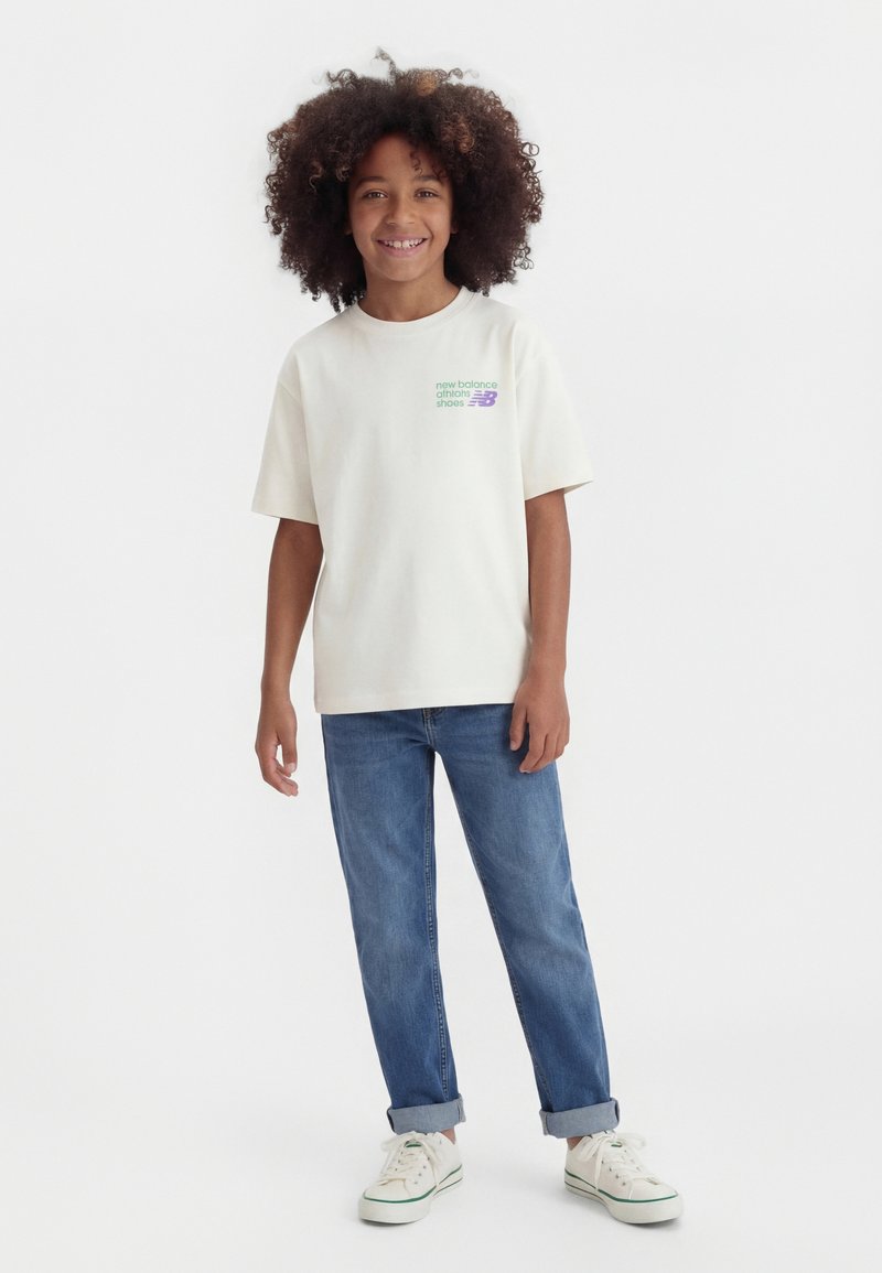 Enfant souriant aux cheveux bouclés portant un T-shirt blanc New Balance, un jean bleu retroussé et des baskets blanches, debout devant un fond uni.