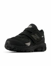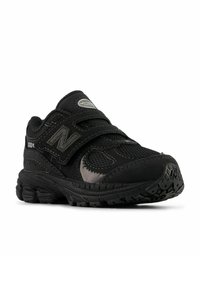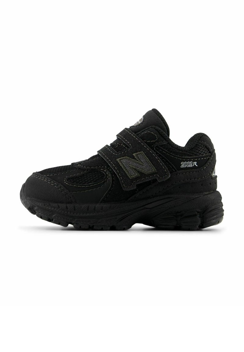 Baskets New Balance 2002R noires avec panneaux en mesh et daim, dotées de deux sangles en Velcro et d'une semelle épaisse et texturée.
