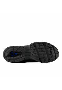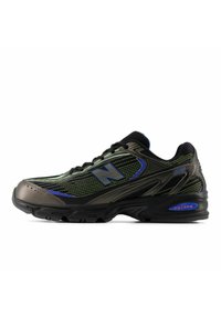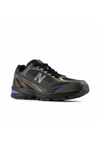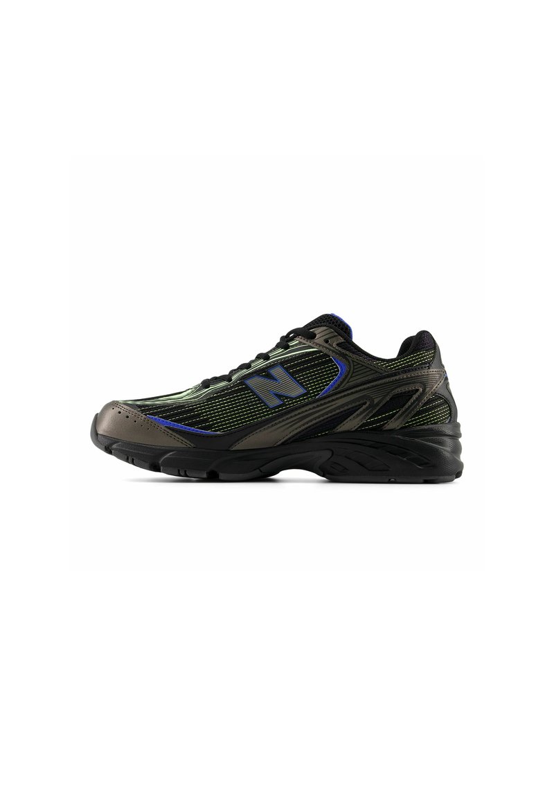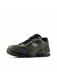 Baskets de sport pour hommes, noir et vert foncé avec des accents bleus et une semelle texturée, vue de côté sur fond blanc.