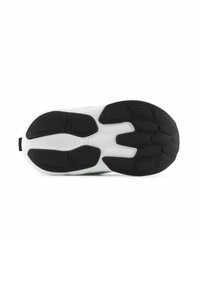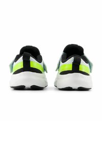 Chaussure de sport blanche avec accents noirs, tige en mesh et bande verte néon. Dispose d'une semelle intermédiaire blanche épaisse et d'une semelle extérieure en caoutchouc.