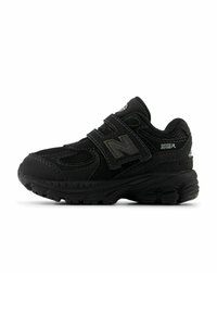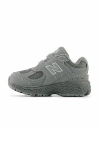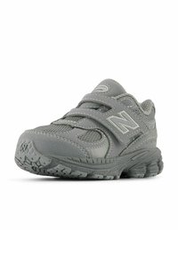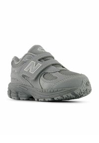 Baskets New Balance 2002R grises avec panneaux en mesh et daim, deux sangles Velcro, semelle rembourrée, et logo "N" de la marque sur le côté.