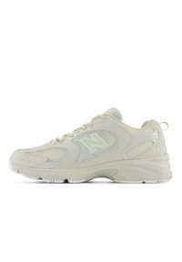Baskets de sport New Balance beige clair avec tige en mesh et synthétique, semelle rembourrée et fermeture à lacets, présentées en vue de profil.