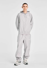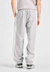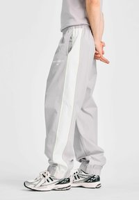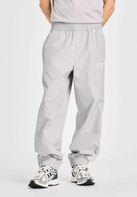 Personne portant un pantalon de survêtement New Balance gris clair avec des poignets élastiques et des chaussures de sport blanches et noires, se tenant contre un fond blanc.