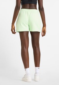 Shorts en coton vert menthe avec une taille élastique et un cordon de serrage. Présente des fentes sur les côtés et un petit logo blanc sur l'ourlet gauche.