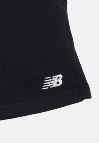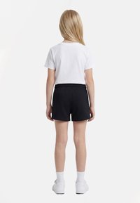 Jeune fille debout, portant un t-shirt blanc, un short noir à cordon, des chaussettes blanches et des baskets blanches sur un fond uni.