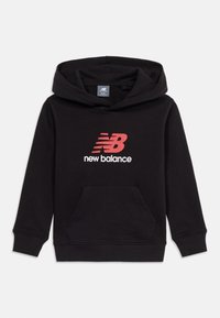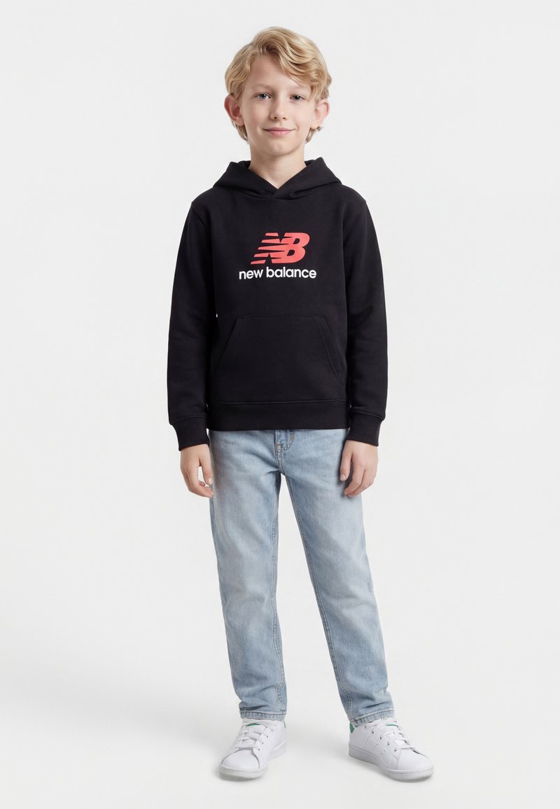 Garçon debout, portant un sweat à capuche noir New Balance, un jean bleu clair et des baskets blanches, sur un fond blanc uni.