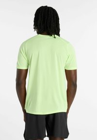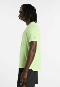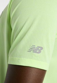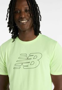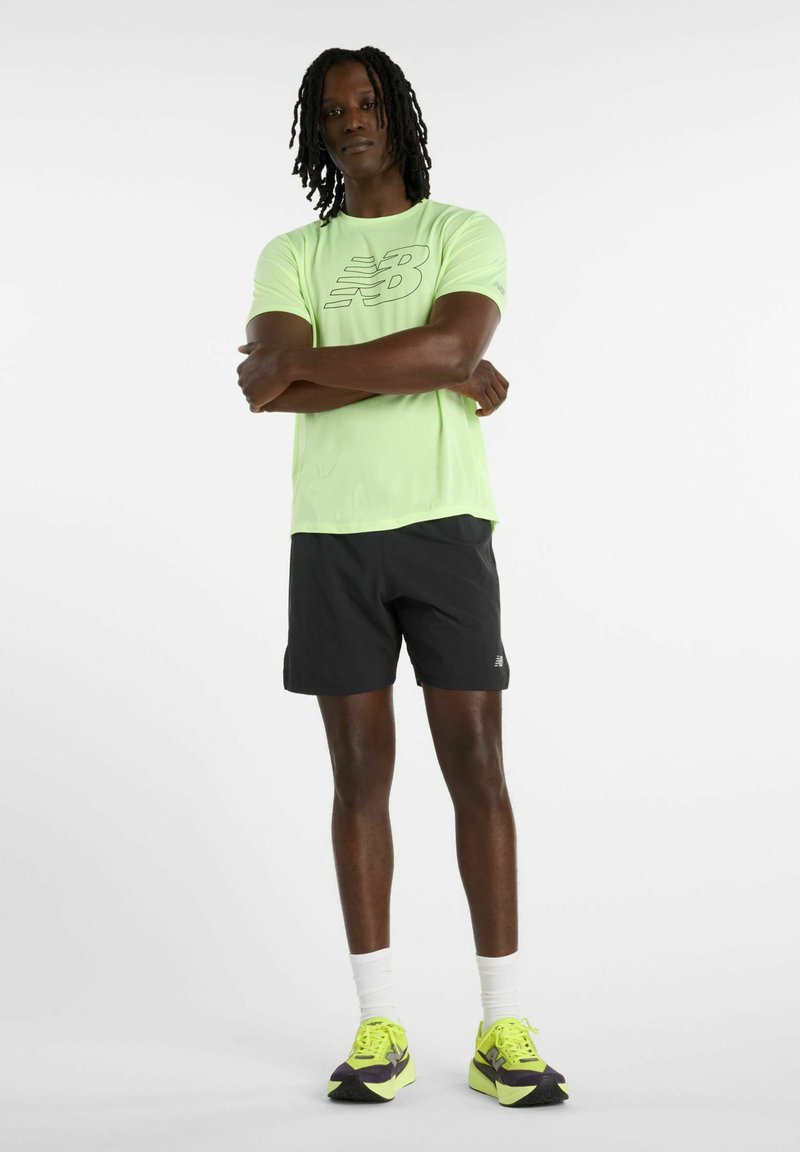 Homme aux dreadlocks debout, les bras croisés, portant un t-shirt New Balance vert citron, un short noir, des chaussettes blanches et des chaussures de course néon.