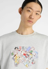 T-shirt gris à manches courtes avec un imprimé graphique coloré de diverses étiquettes et tickets au centre. Col rond.