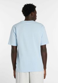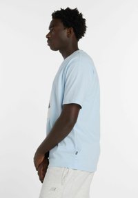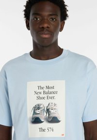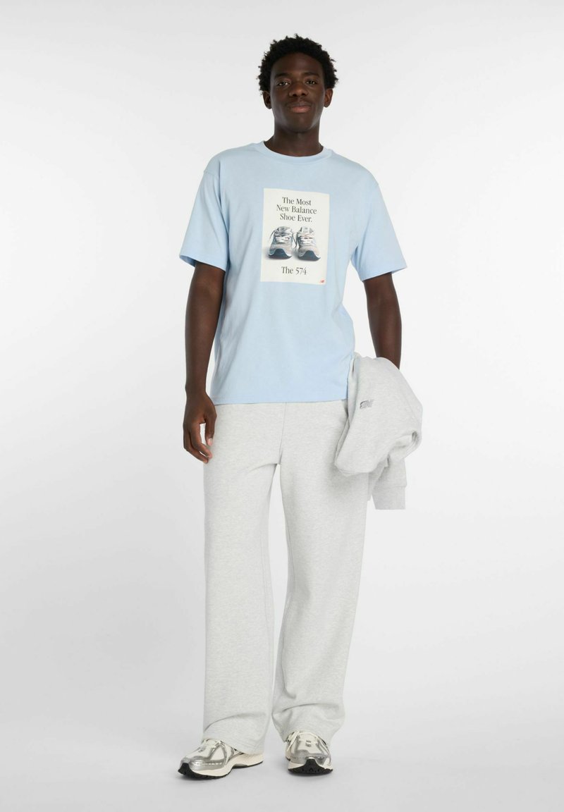 Homme portant un t-shirt graphique New Balance bleu clair, un pantalon de survêtement gris clair et des baskets, tenant un sweat-shirt gris plié.