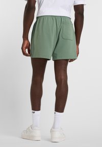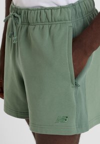 Homme portant un short sarrouel vert olive avec cordon de serrage, des chaussettes blanches montantes et des baskets blanches New Balance, debout devant un fond uni.