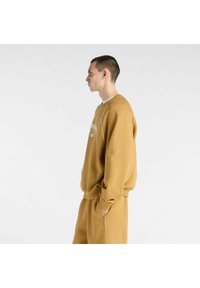 Jeune personne portant un sweat-shirt New Balance couleur moutarde et un short assorti avec des baskets blanches, debout devant un fond gris uni.