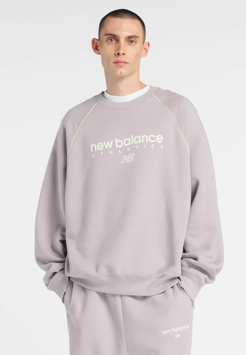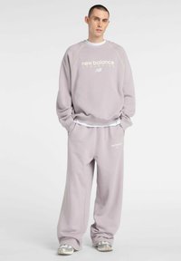 Jeune homme portant un sweat-shirt New Balance Athletics violet clair et un pantalon de survêtement assorti, debout les mains dans les poches.
