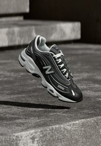 Baskets New Balance 1000 en noir et blanc avec des lacets blancs, suspendues au-dessus d'une surface en béton rugueuse avec des marches en pierre en arrière-plan.