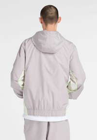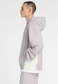 Jeune homme portant une veste à capuche zippée gris clair avec un bord néon jaune et un pantalon assorti, debout devant un fond uni.