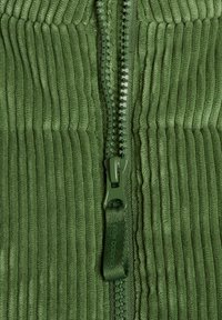 Gilet en velours côtelé orange brûlé avec un col haut, une fermeture éclair et une texture matelassée. Présente un patch logo et des poches latérales. Porté par-dessus un haut blanc.