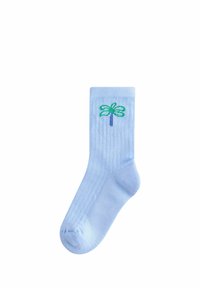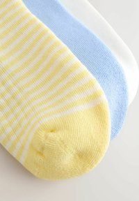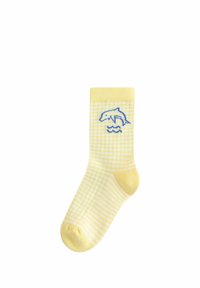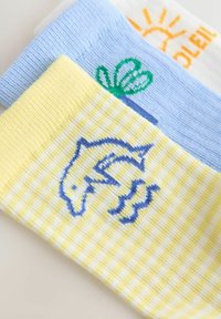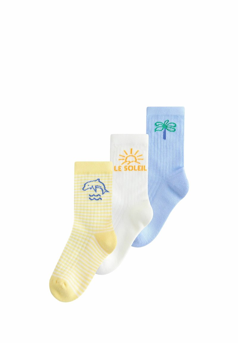 Trois chaussettes colorées avec des motifs estivaux : dauphin jaune sur des vagues, soleil blanc avec le texte "LE SOLEIL", et palmier bleu.