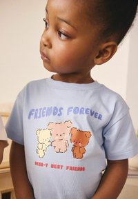 Deux enfants portent des t-shirts en gros plan, l'un crème avec des visages d'ourson et le texte « bear-y cute », l'autre bleu clair, tous deux debout côte à côte.
