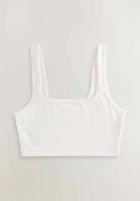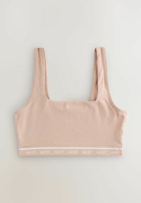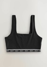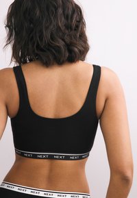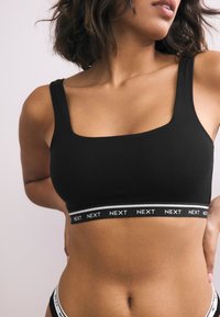 Femme portant un soutien-gorge de sport noir et des sous-vêtements assortis avec le nom de la marque "NEXT" sur les bandes élastiques, posant les mains derrière le dos.