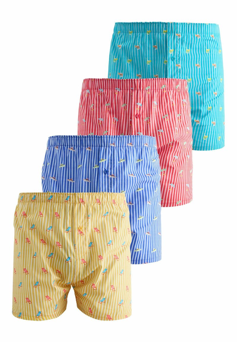 Quatre boxers rayés en jaune, bleu, rouge et turquoise, chacun avec de petits motifs colorés sur le thème de l'été et une fermeture à boutons à l'avant.