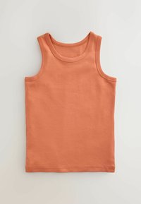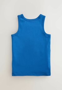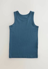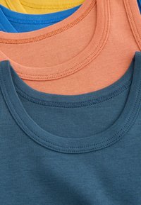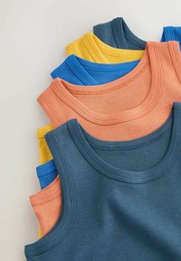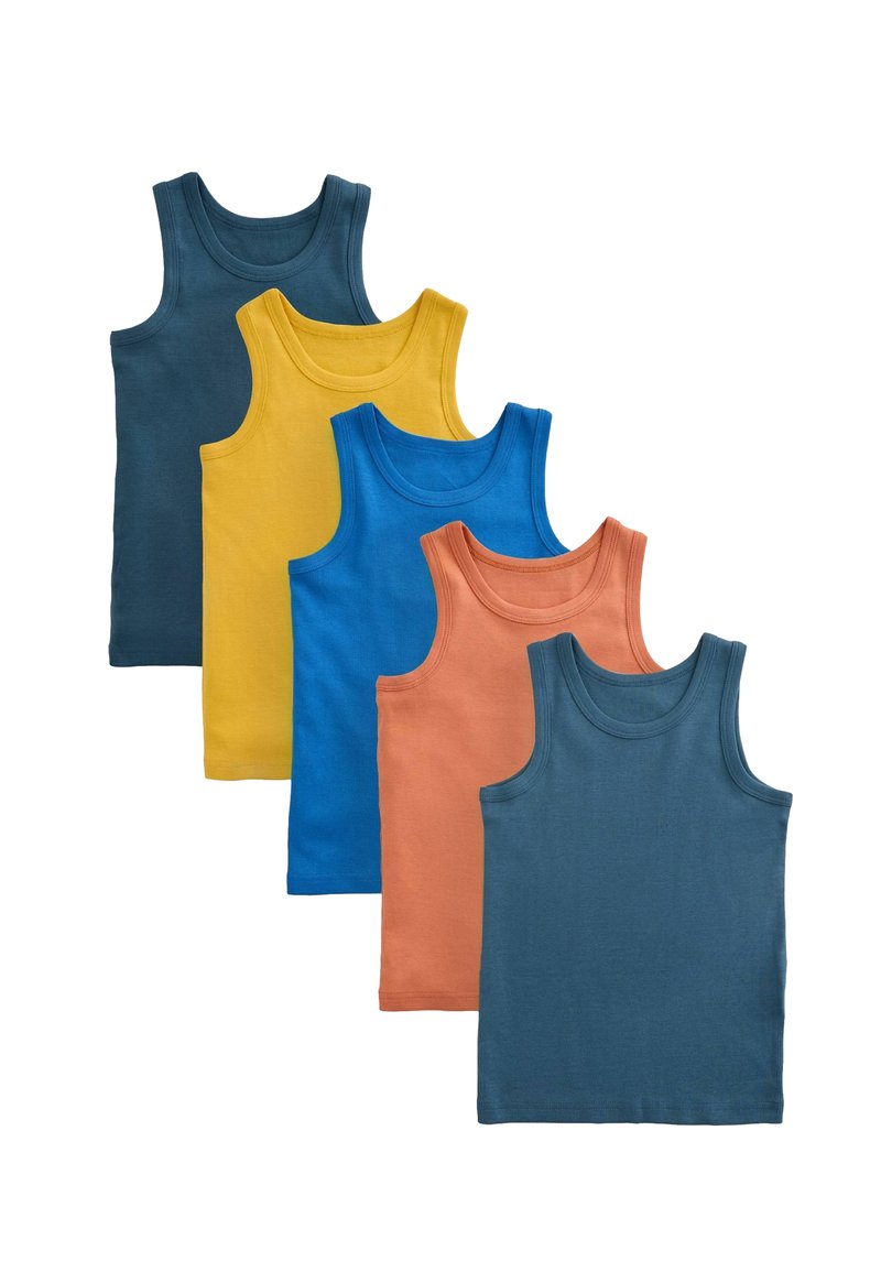 Cinq débardeurs unis sans manches en sarcelle, jaune, bleu, orange et sarcelle foncé disposés en superposition sur un fond blanc.