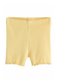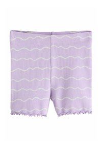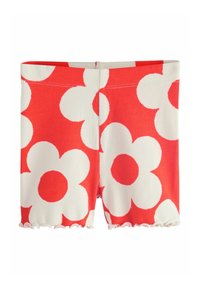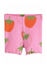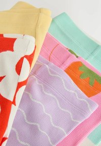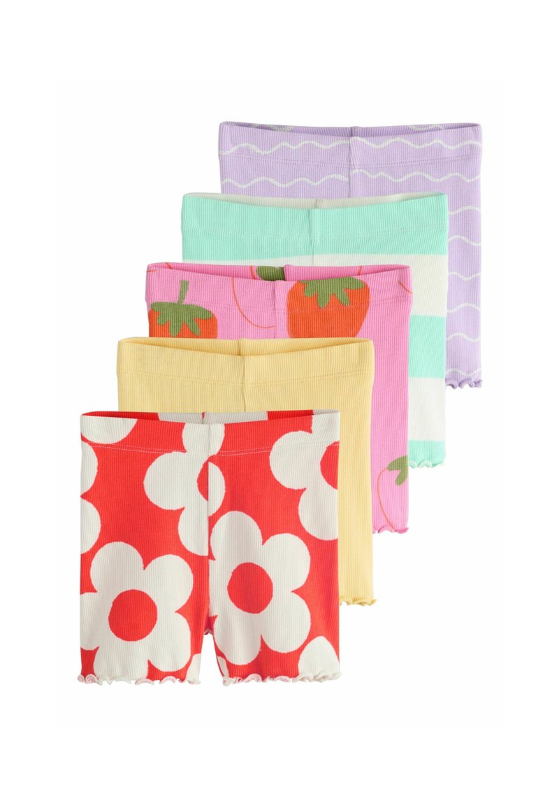 Cinq paires de shorts en tissu côtelé avec différents motifs colorés, comprenant rouge avec des fleurs blanches, jaune, rose avec des fraises, rayures turquoises et violet avec des vagues blanches.