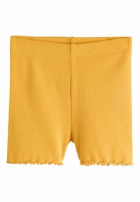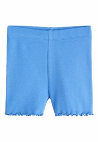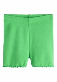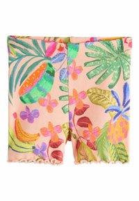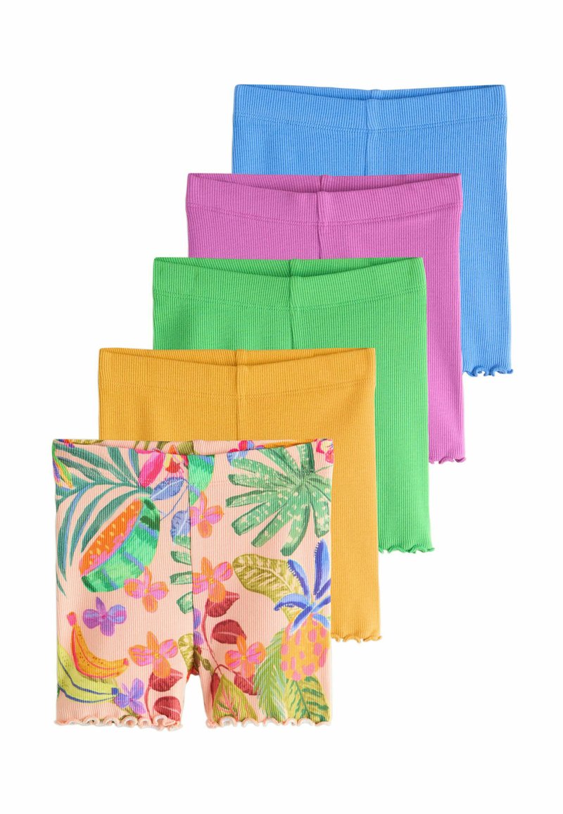 Cinq paires de shorts en maille côtelée pour enfants, en bleu, violet, vert, jaune et imprimé tropical multicolore, disposées en chevauchement.