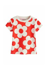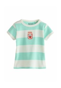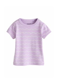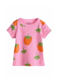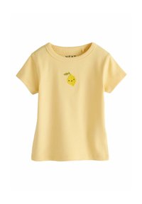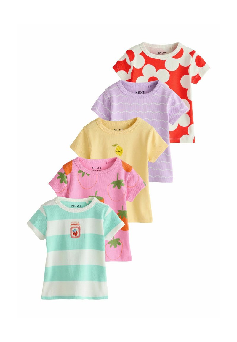 Cinq t-shirts colorés à manches courtes pour tout-petits avec des motifs ludiques : rouge avec des cercles blancs, violet avec des vagues blanches, jaune avec citron, rose avec fruits, rayures menthe avec bocal.