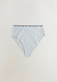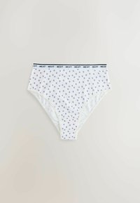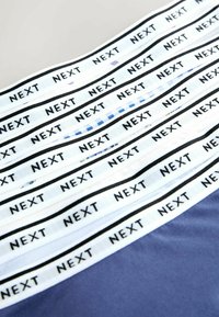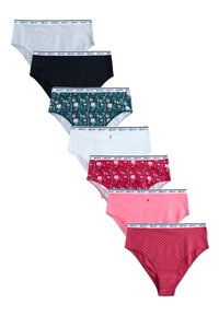 Sept paires de slips en coton pour femme de couleurs et motifs assortis, chacun avec une ceinture blanche imprimée "NEXT".