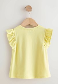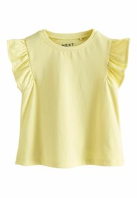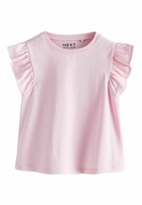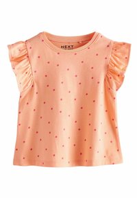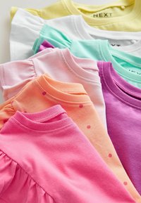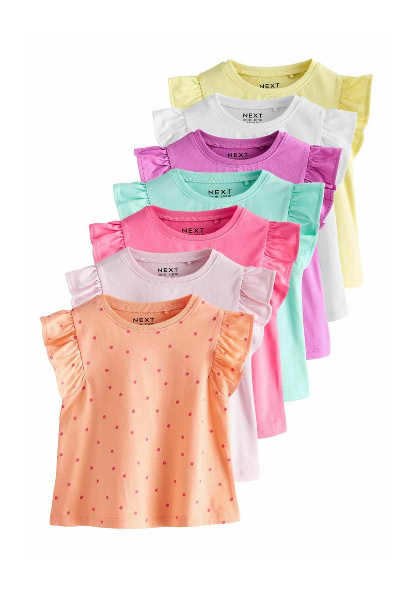 Sept hauts pour filles à manches courtes avec manches à volants en pêche avec des pois roses, rose clair, rose, turquoise, violet, blanc et jaune.