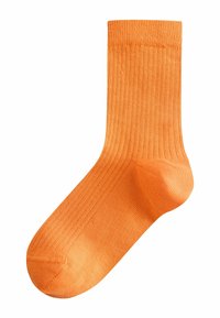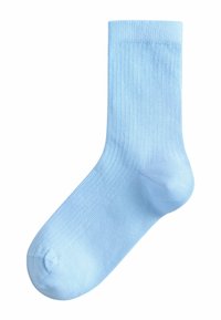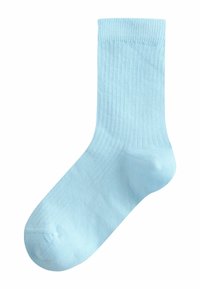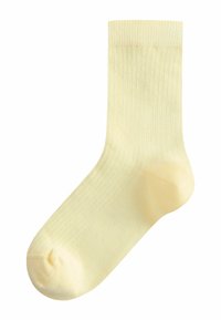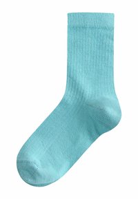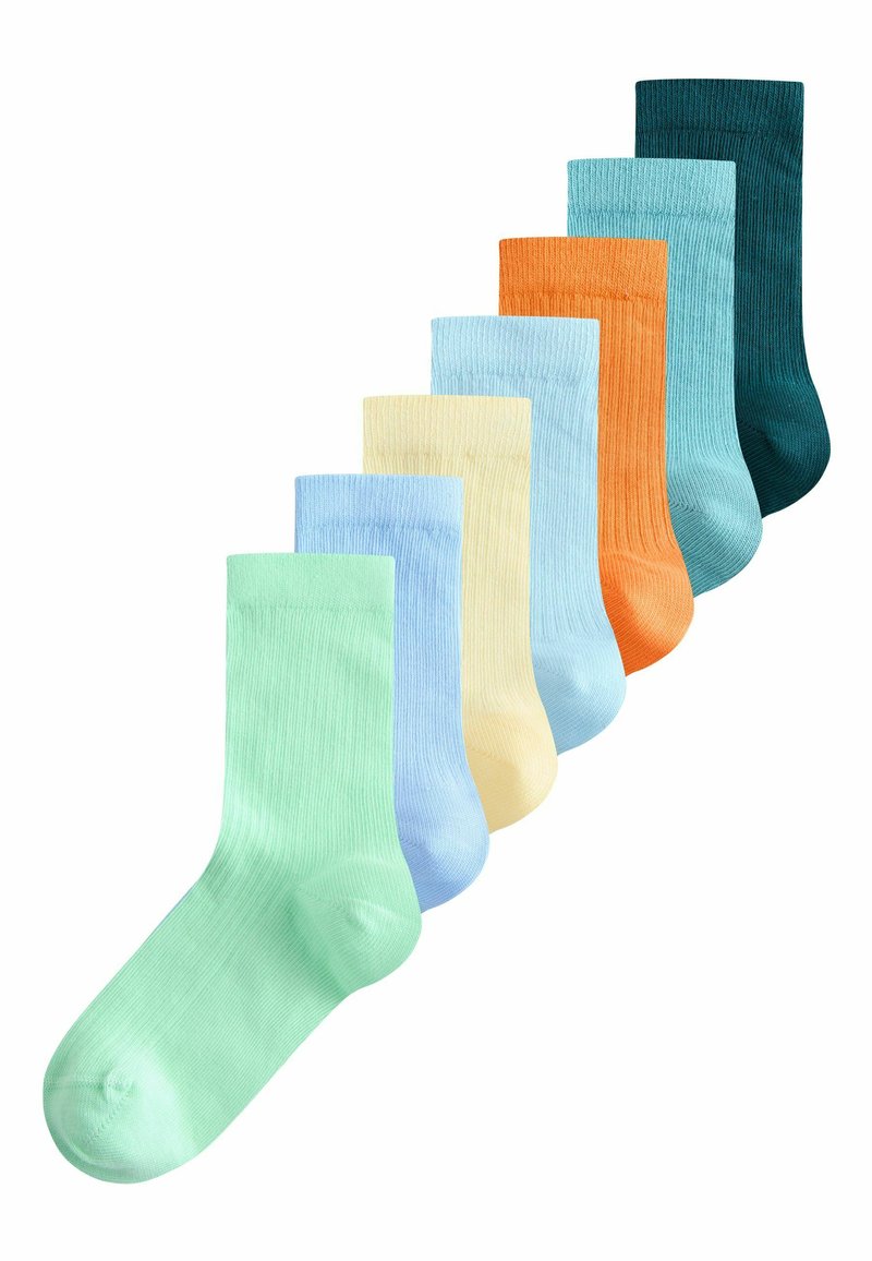 Sept paires de chaussettes montantes côtelées en vert pastel, bleu clair, crème, bleu pâle, orange, bleu canard et vert foncé disposées en rangée diagonale.