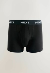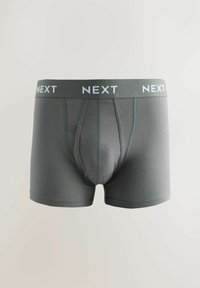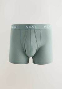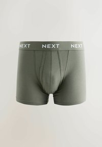 Cinq paires de boxers pour hommes dans différentes nuances de vert, gris et noir, chacune avec une ceinture élastique de marque "NEXT".
