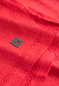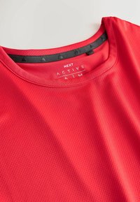 T-shirt de sport rouge à manches courtes avec col rond, texture subtile, et petit logo noir près de l'ourlet inférieur sur un fond blanc.