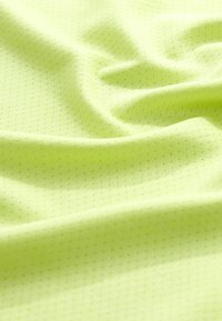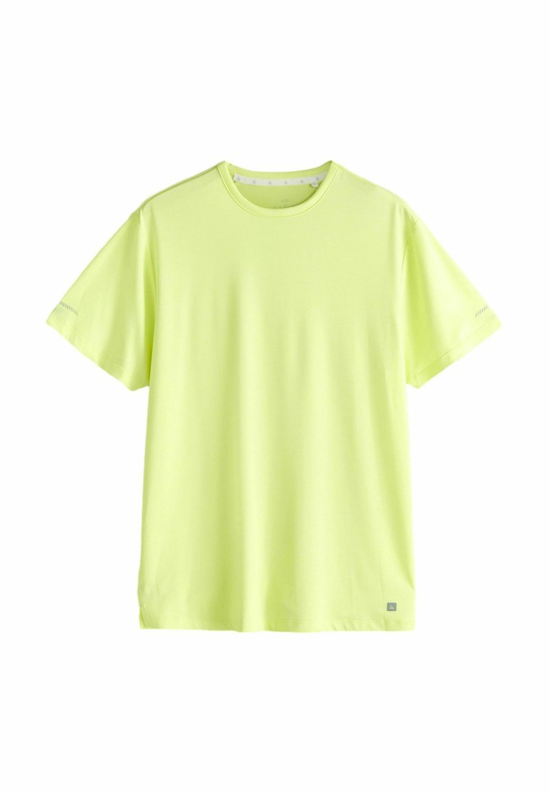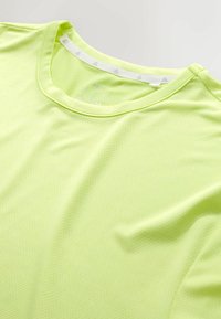 T-shirt jaune vif à manches courtes avec un col rond et un petit logo réfléchissant près de l'ourlet inférieur sur un fond blanc.