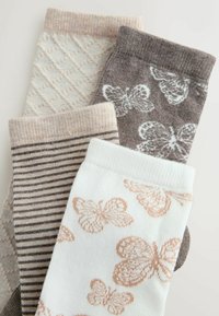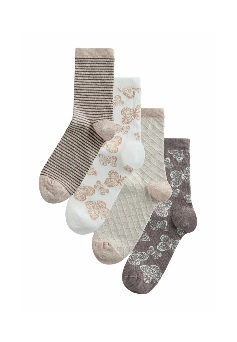 Quatre paires de chaussettes mi-mollet dans des tons beige et marron avec des motifs : rayures, papillons, maille losange, et imprimés papillons.