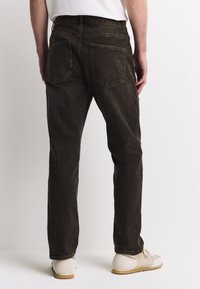 Homme portant un jean droit marron foncé et des baskets beiges, debout de dos sur un fond blanc uni.