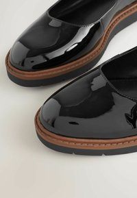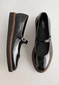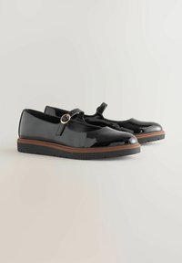 Chaussure Mary Jane en cuir verni noir avec bout arrondi, bride unique et boucle dorée, semelle intermédiaire marron et semelle extérieure en caoutchouc noir épais.