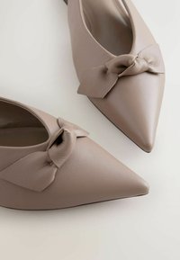 Chaussure plate beige à bout pointu avec bride arrière et petit nœud décoratif sur le dessus, dotée d'un petit talon superposé.