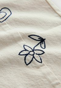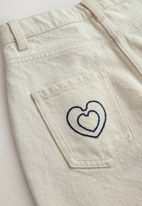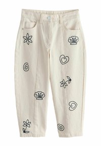 Pantalon de couleur crème avec des motifs brodés noirs comprenant des fleurs, des cœurs, des coquillages et des spirales sur les jambes avant et les poches.