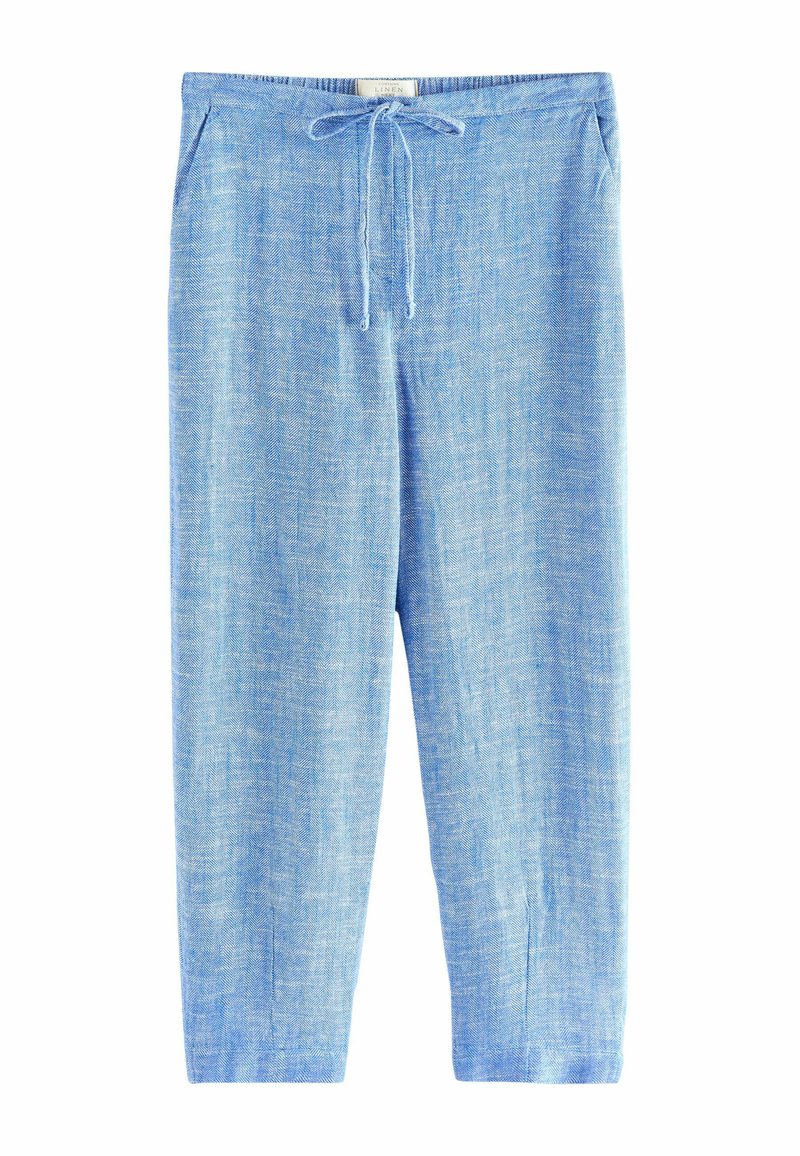 Pantalon en lin bleu clair avec motif chevrons, taille élastique avec cordon de serrage, poches latérales, coupe fuselée, texture lisse.