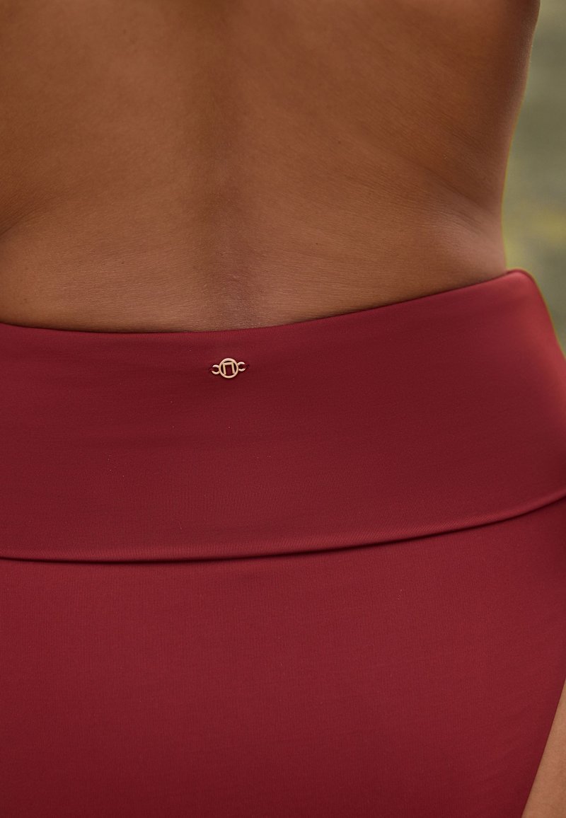 Le milieu du corps d'une personne portant un maillot de bain taille haute rouge foncé avec un petit emblème circulaire doré sur la ceinture.