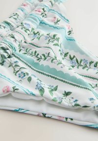 Bikini tanga à motif floral en vert clair et blanc, avec des bretelles fines et une taille froncée ornée de vignes et de petites fleurs.